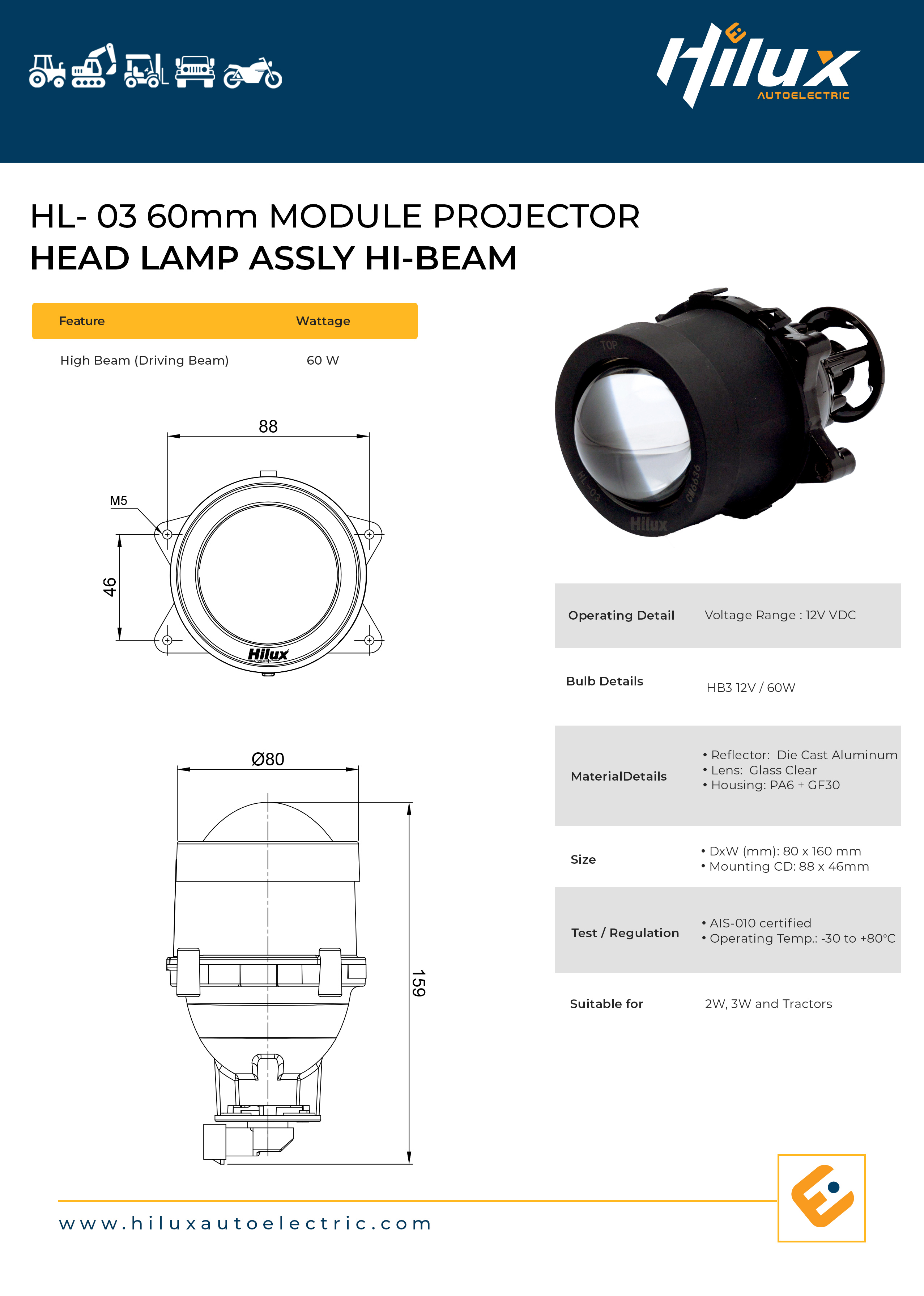 Specifications PROJECTOR HIGH BEAM 60mm